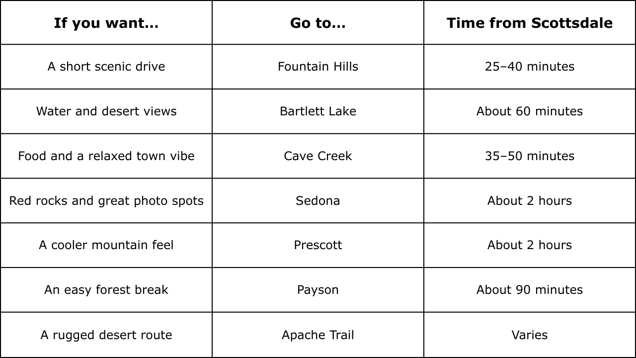 Scottsdale is a strong base for day trips. You can drive for 30 minutes and feel like you escaped the city. You can drive for two hours and reach a completely new landscape.